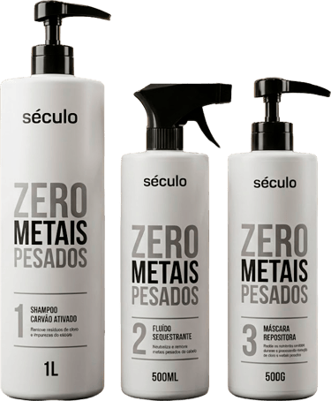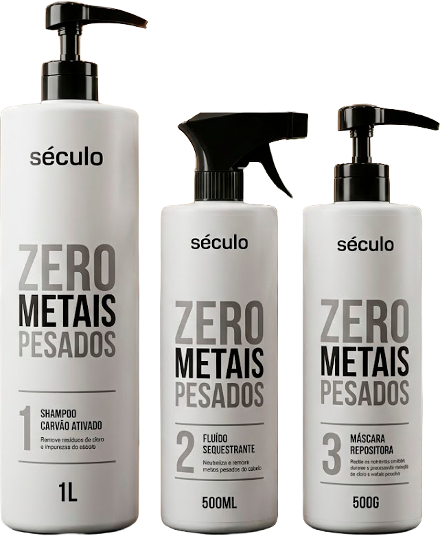 O KIT ZERO METAIS PESADOS é o protocolo pré-química em 3 passos que remove impurezas, cloro e metais pesados — preparando o fio para descoloração e alisamento com muito mais segurança.